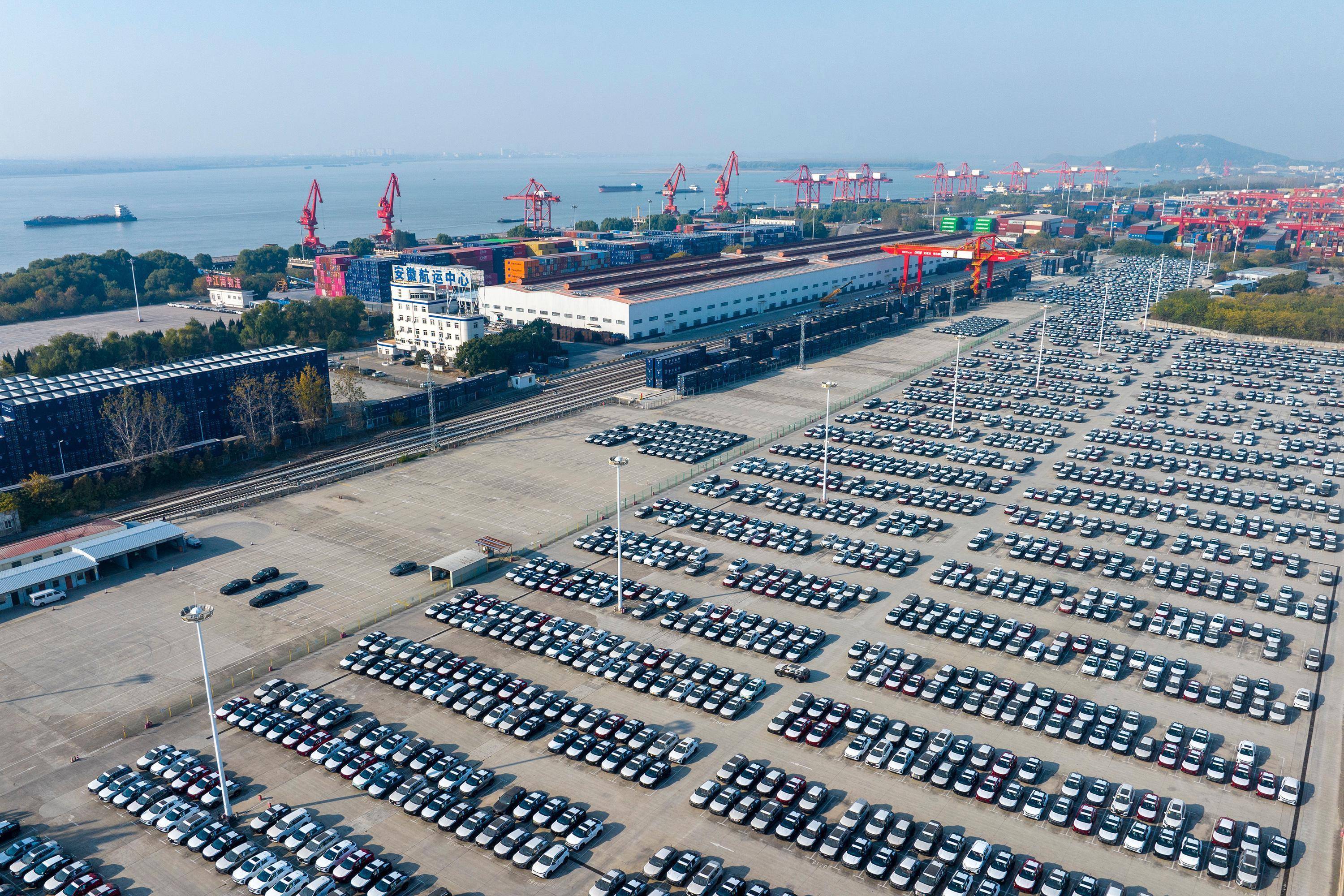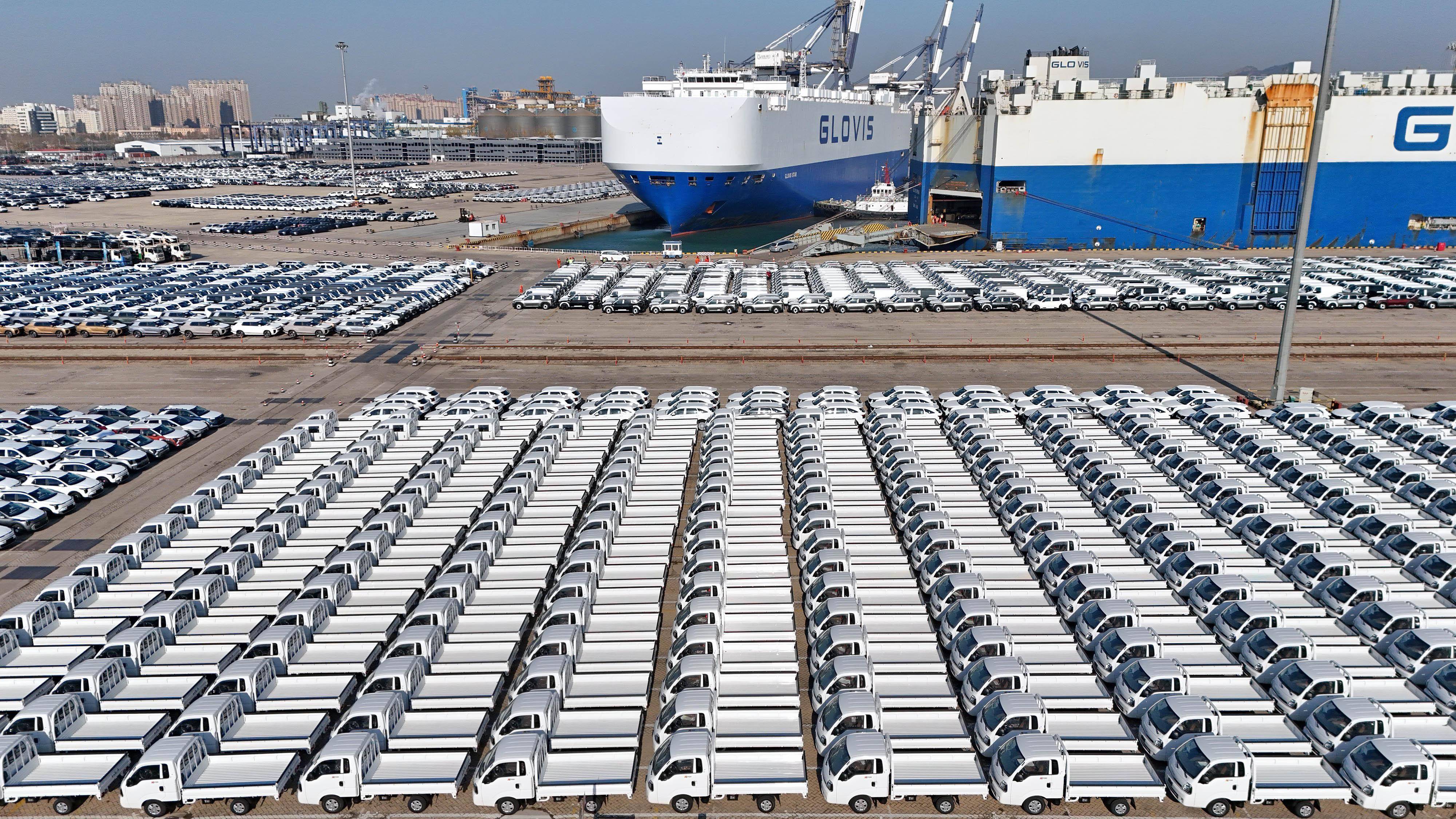 12月4日,汽车停在山东港口烟台港等待装船(无人机照片)。 新华社发(唐克摄)