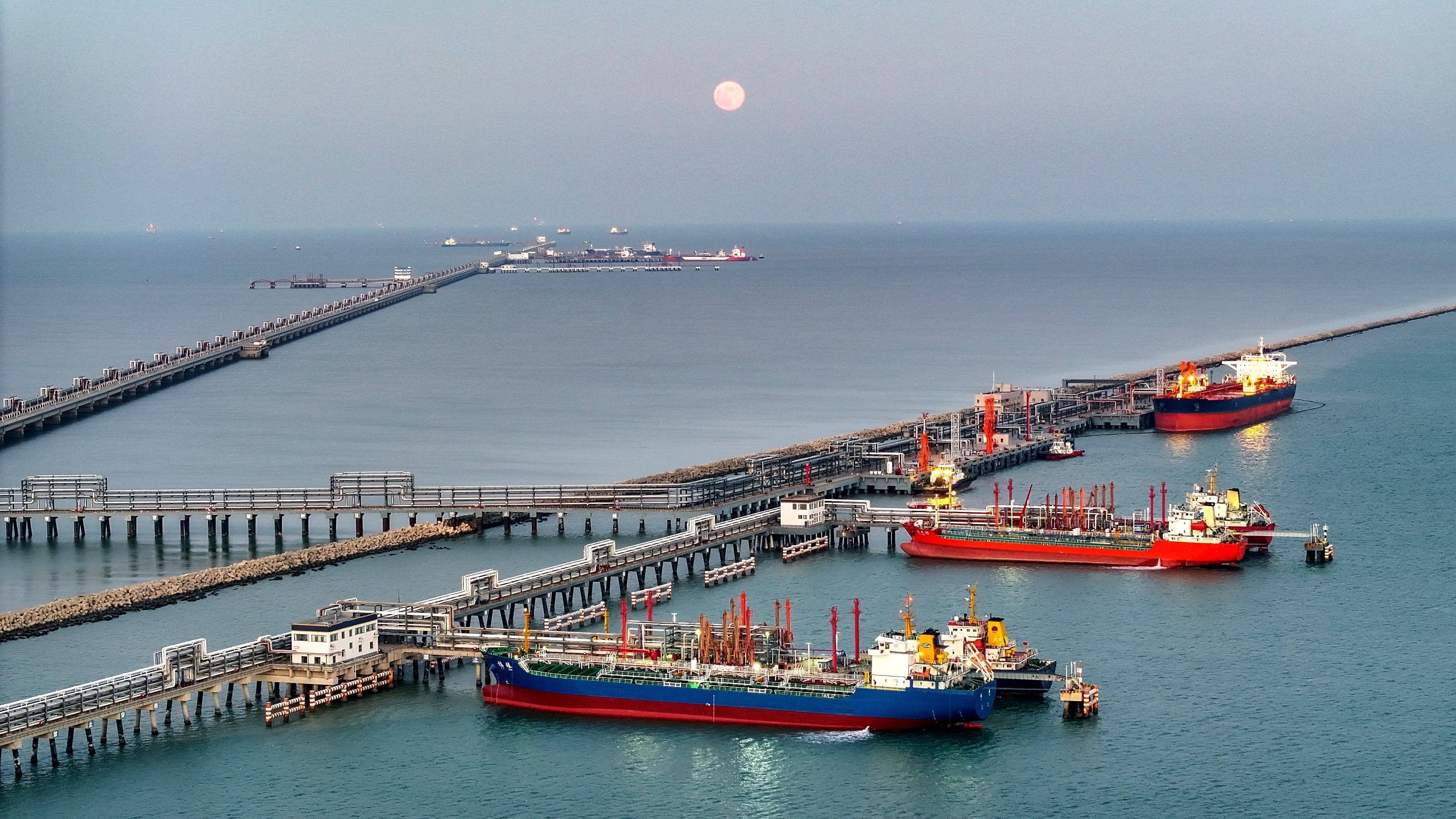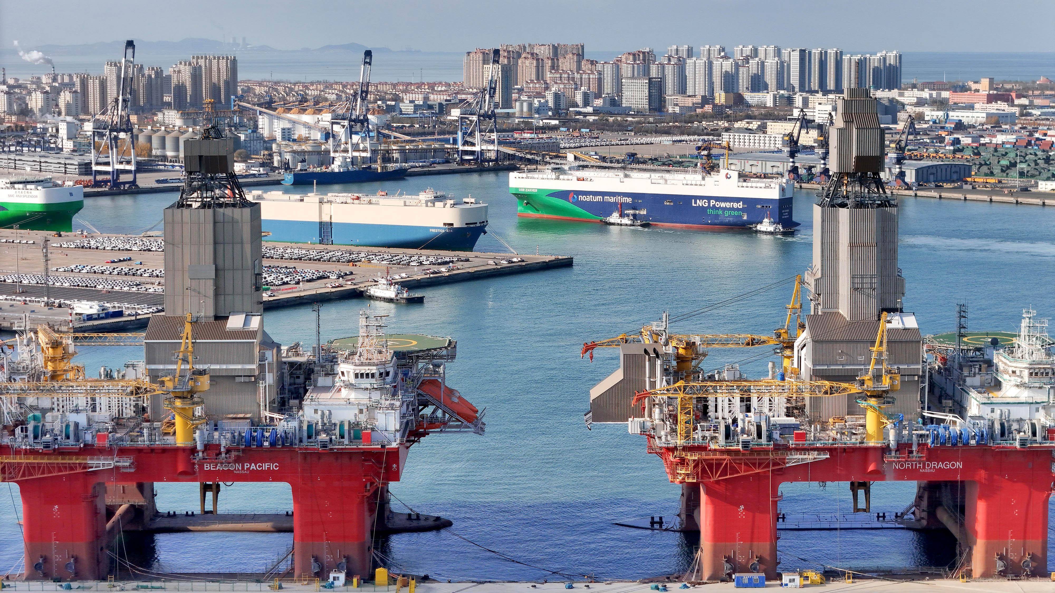 12月5日在山东东营港拍摄的作业场景(无人机照片)。 新华社发(周广学摄)↑点击视频欣赏山东港口青岛港景象。(摄制:俞方平)