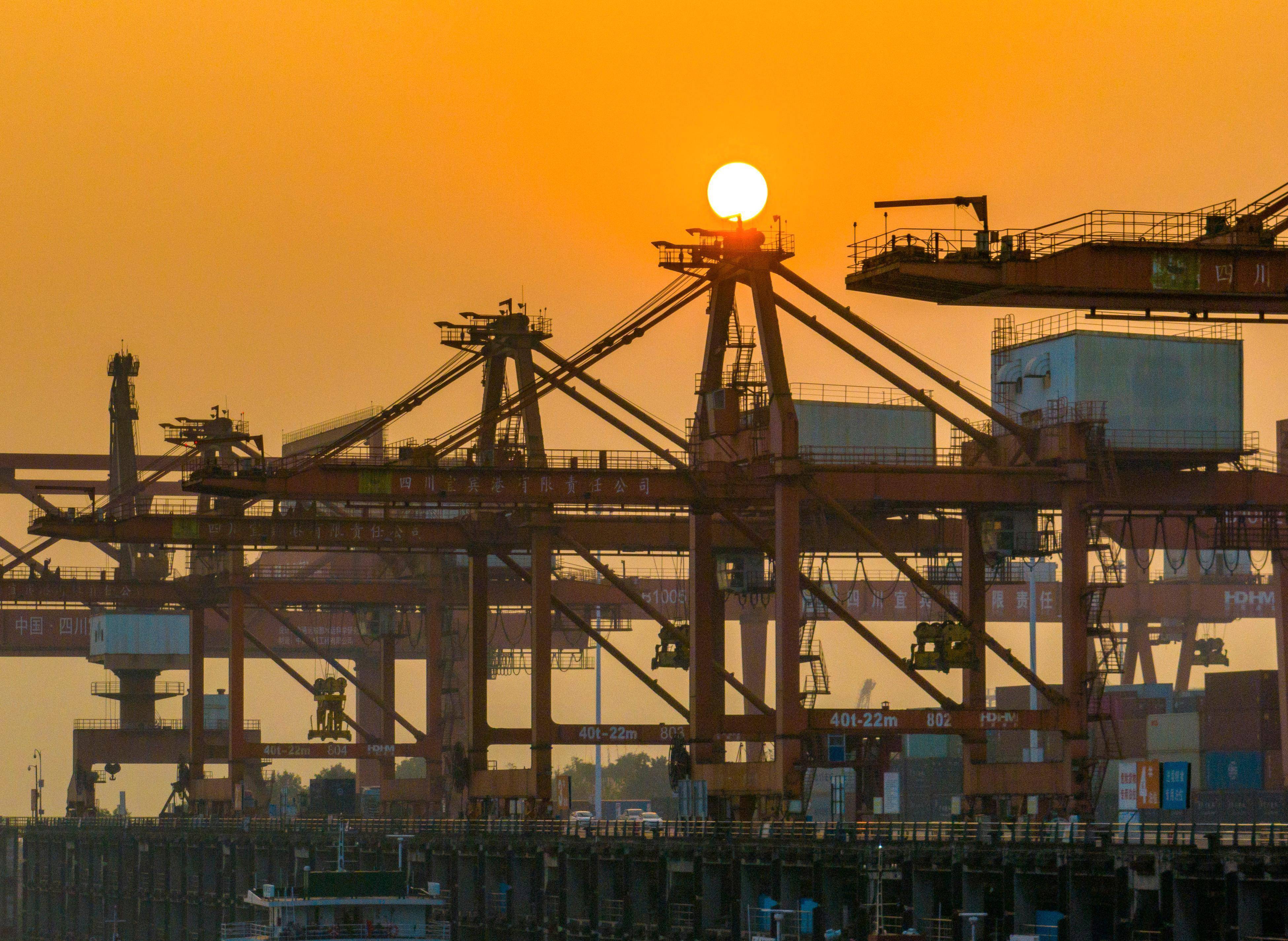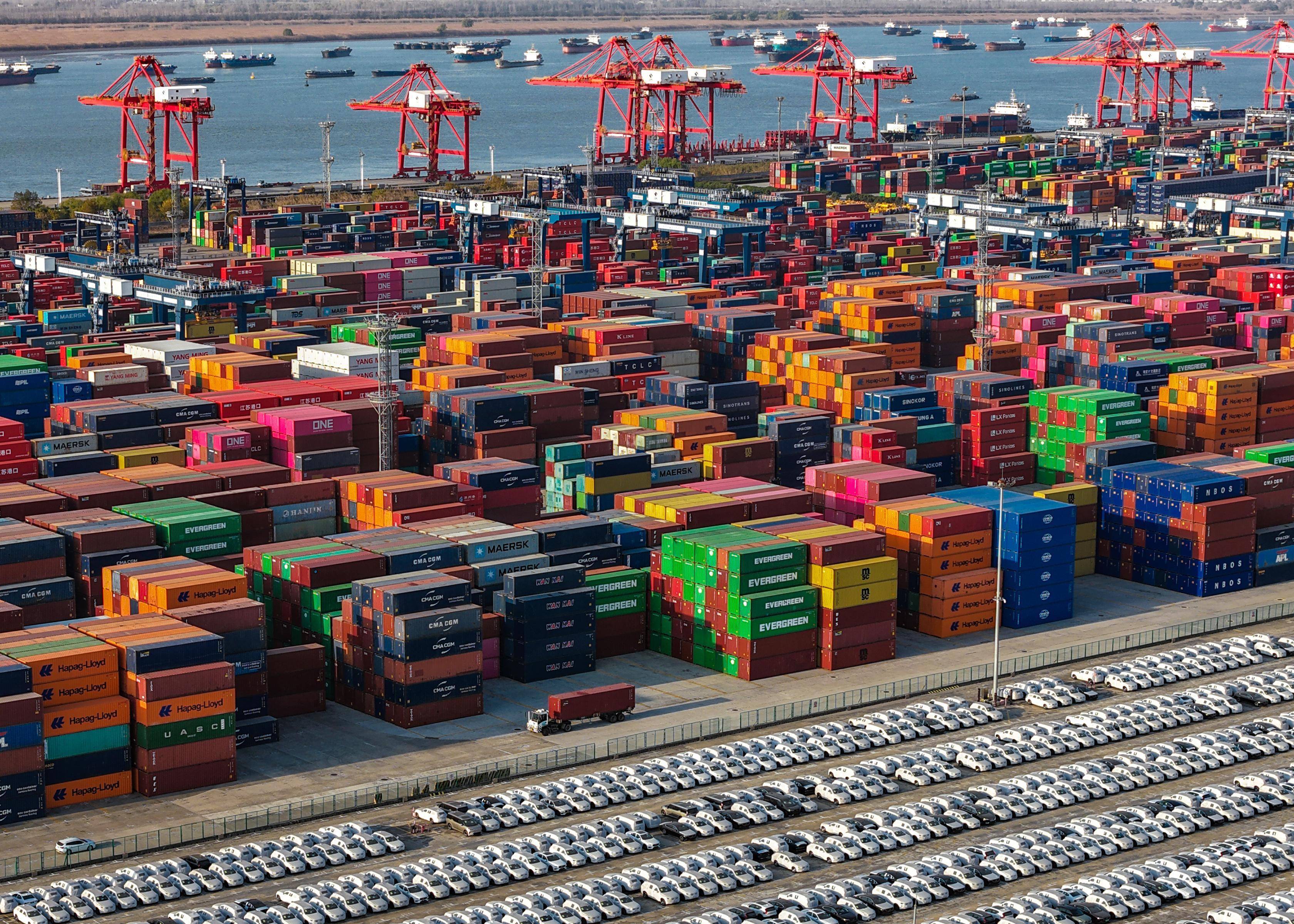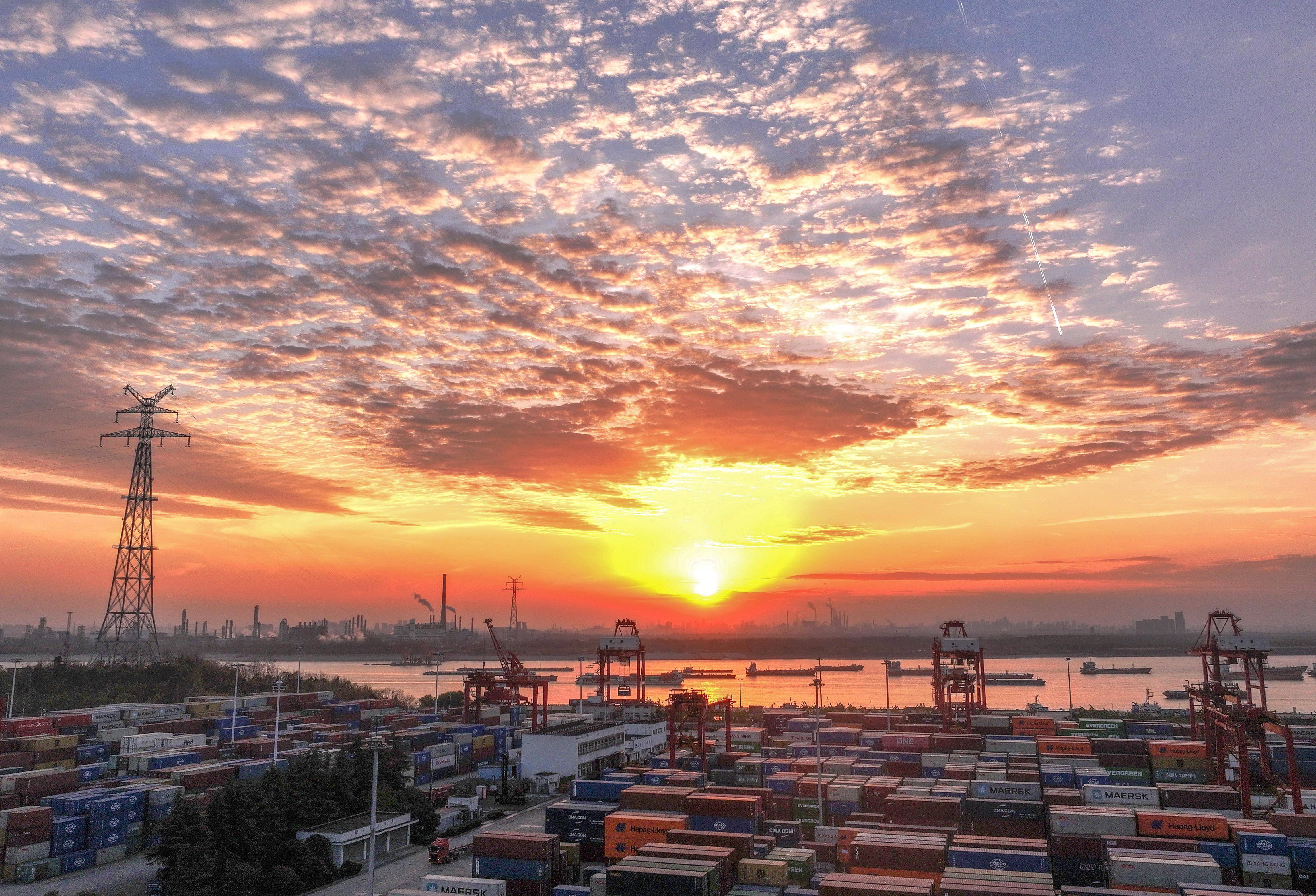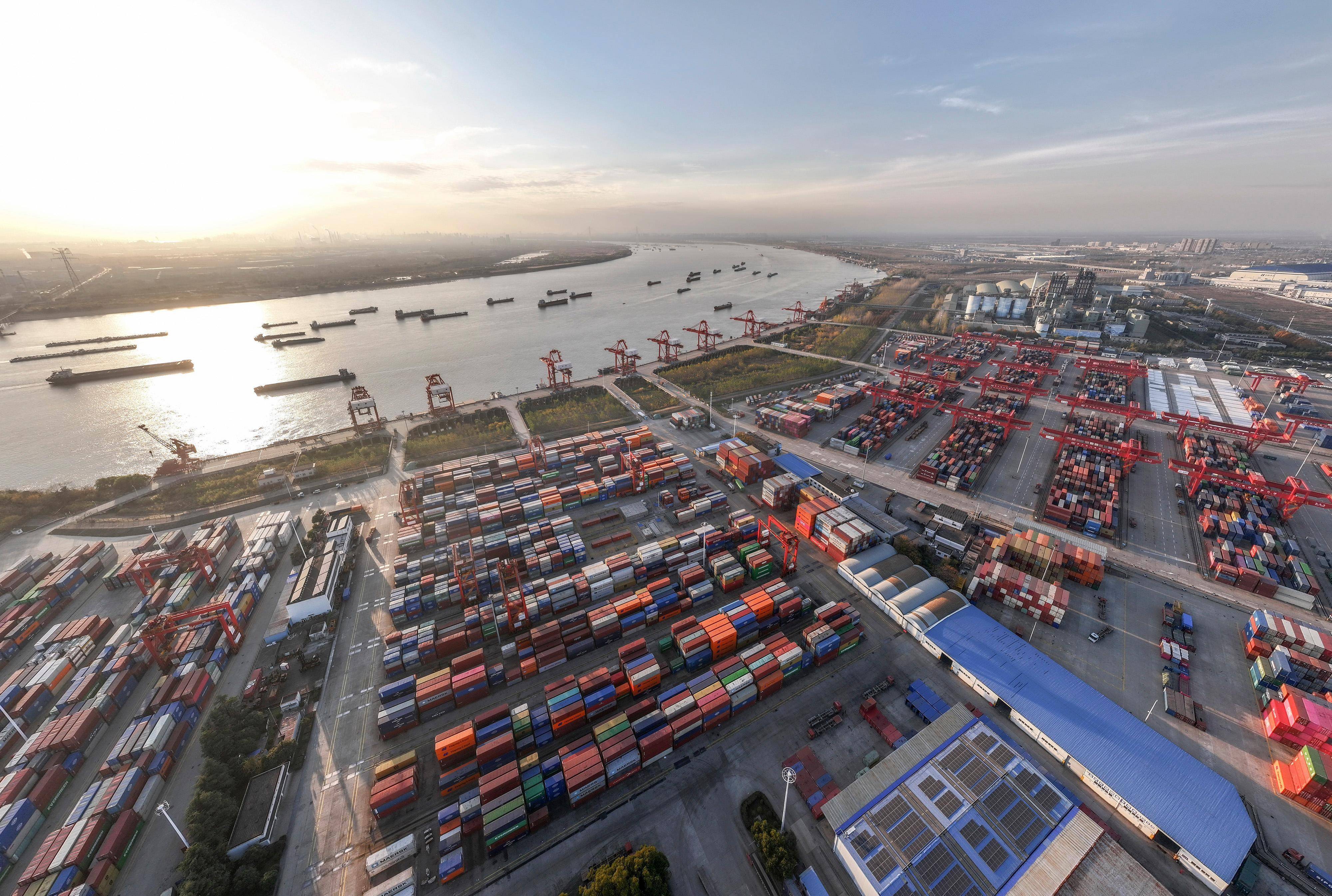 12月8日拍摄的南京港龙潭港区集装箱堆场(无人机照片)。 新华社发(辛一摄)