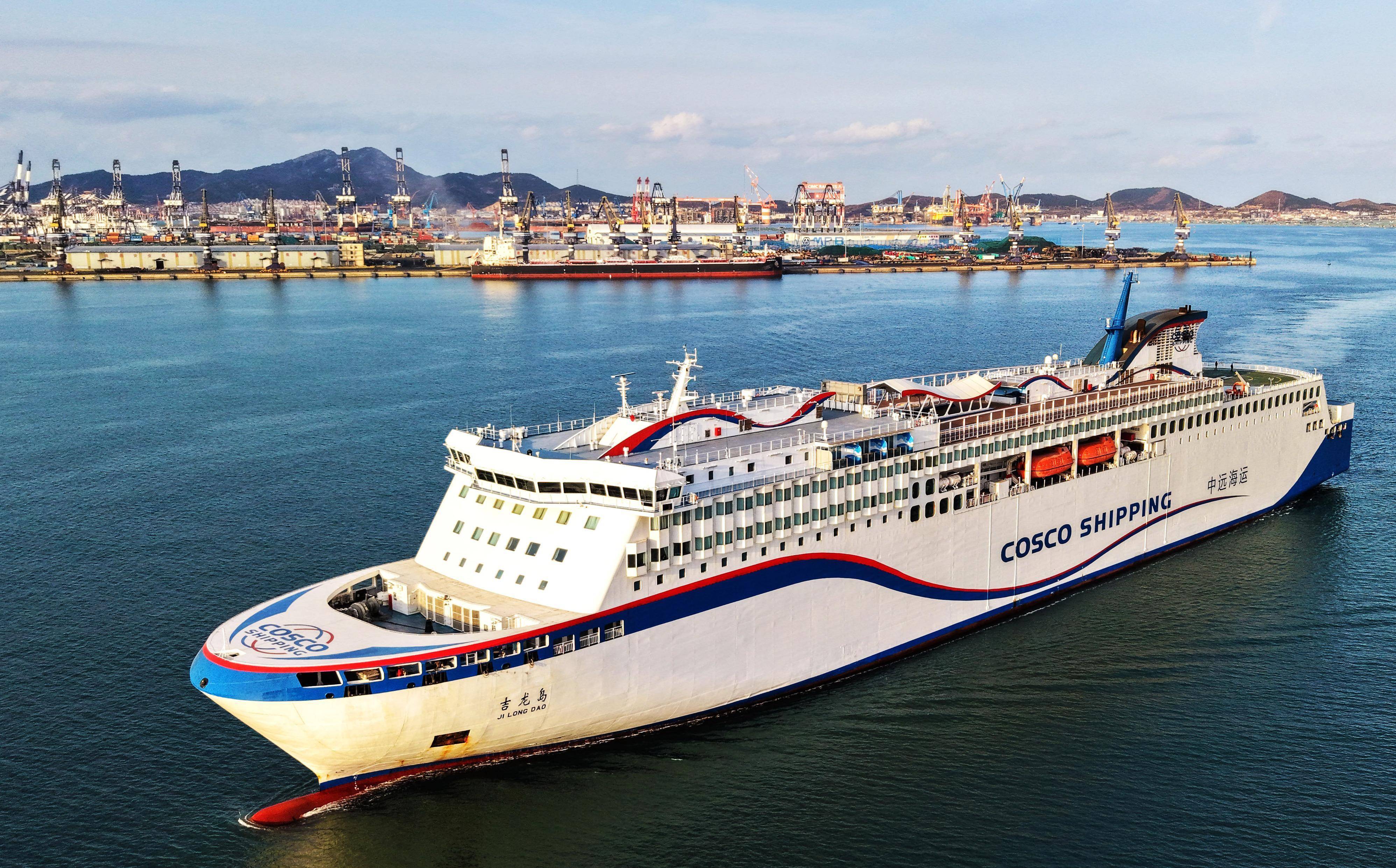 12月5日,在山东港口日照港集装箱码头,满载集装箱的船舶驶离港口(无人机照片)。 新华社发(李大伟摄)