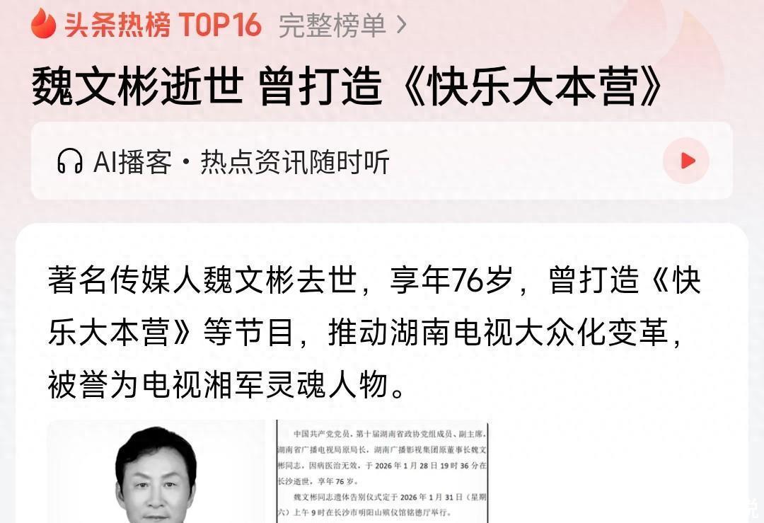 原湖南广电局长魏文彬离世,这个名字或许不像何炅谢娜那般家喻户晓,但正是这个男人,他一手打造了《快乐大本营》这档定义国民综艺的王牌节目,让无数人的周末夜晚,多了一段守在电视机前的开怀时光。