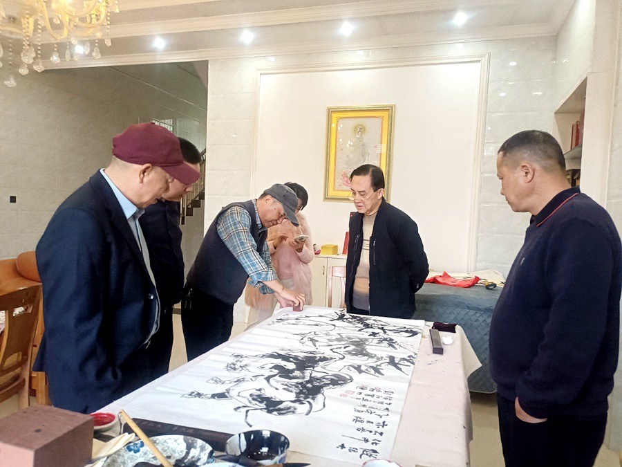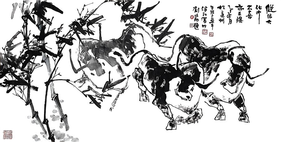 朱龙县长推介家乡心切,亲自向采风小组推荐参观路线,濂溪书院、周敦颐故居、何绍基宗祠探花第进士楼、龙村古镇,等等;尤其说起龙舟文化、稻作文化、书法文化、廉洁文化、红色文化、古村文化、神秘文化,如数家珍。兴味正浓时,朱县长突然出一题目:能否请书画家们以陶渊明诗句“纵浪大化中,不喜亦不惧”为题,创作一幅作品,以明“苦而弥坚,挫而愈勇,胜而不骄”之志。采风小组倍受鼓舞,接下来便讨论构思,次日晚由牛朋子画牛、伴江写竹、昆仑题识、伴石刊印,合作完成一幅四尺整张作品。其间劲节凌风,群牛踔力,墨痕如划,作势昂扬,也算充数为道县采风纪念之作。