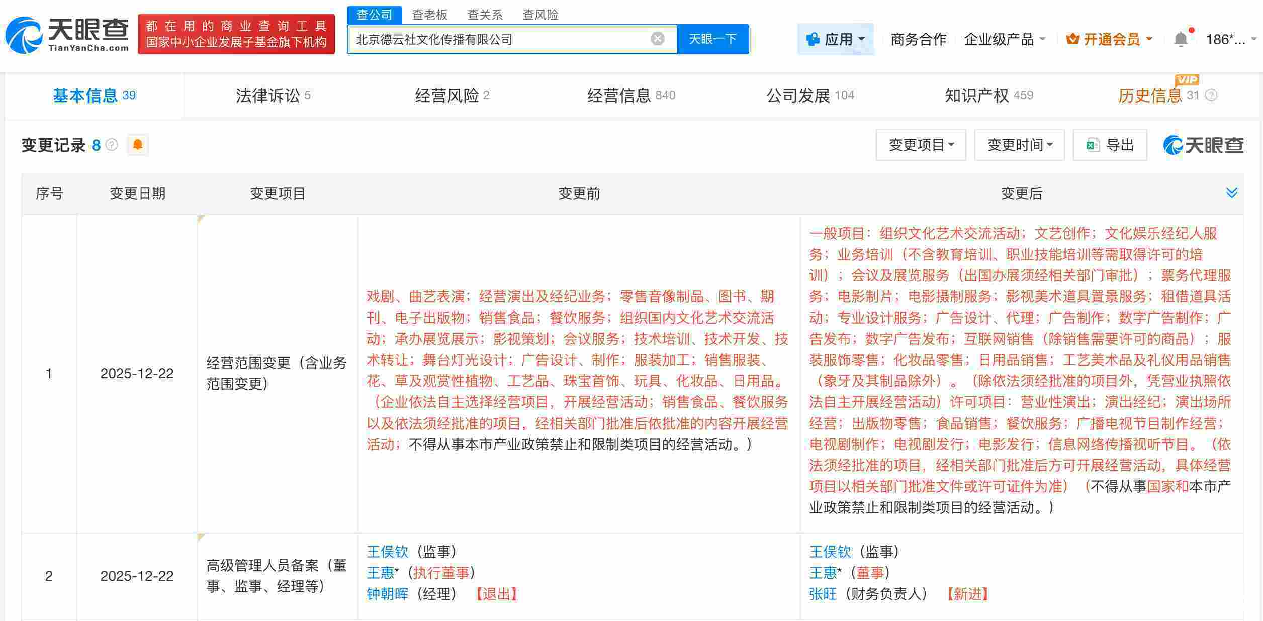 天眼查App显示,近日,北京德云社文化传播有限公司发生工商变更,钟朝晖卸任经理,张旺担任财务负责人,王惠职务由执行董事变更为董事。同时经营范围新增互联网销售、广播电视节目制作经营、电视剧制作、电视剧发行、电影发行等。