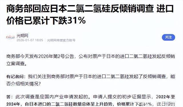 经过了这随后五年的沉默与沉淀,到了2026年的今天,局面已经彻底翻转,此次商务部敢于对日本发起反倾销调查,底气就在于我们在二氯二氢硅电子级高端产品上取得了重大突破。 这是直白地告诉对手,中国已经拥有了独立大规模生产该产品的能力,这把利剑落下的瞬间,实际上宣告了日本相关产品在中国市场的“倒计时”已经开始。